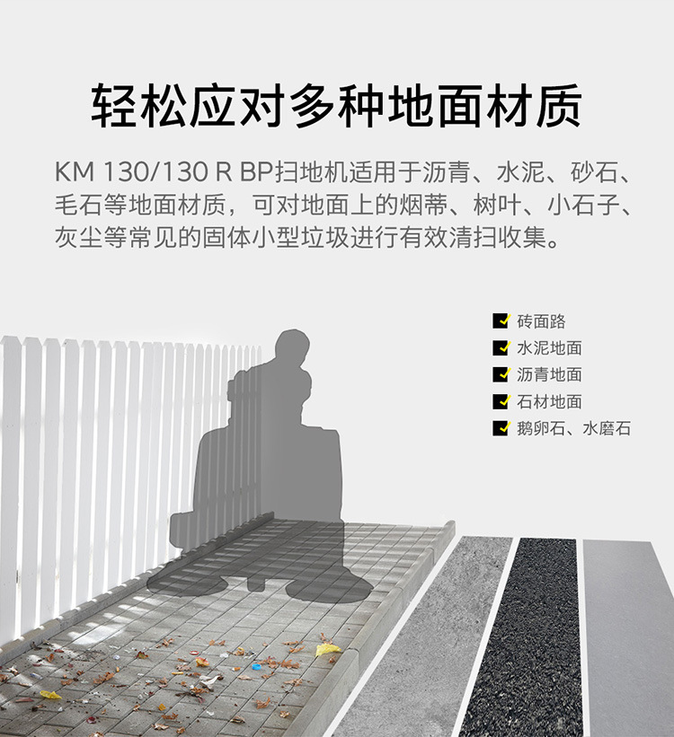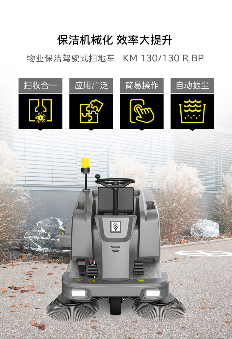 卡赫高品質商業級駕駛式掃地車,清潔寬度1,300mm,每小時可高效清潔7,000㎡以上的地面,告別傳統,有效替代30人以上的人工,可有效清潔瀝青,水泥,砂石,毛石等洗地機無法清洗的地面。