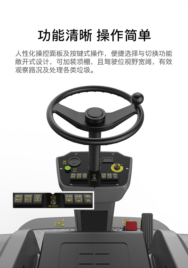 敞開式設計,可加裝頂棚,駕駛式視野極佳,可以有效判斷路口,觀察處理各種 地面垃圾。按鍵式操控按鈕,讓功能選擇和切換都非常簡單,讓清潔更加輕松, 舒適。